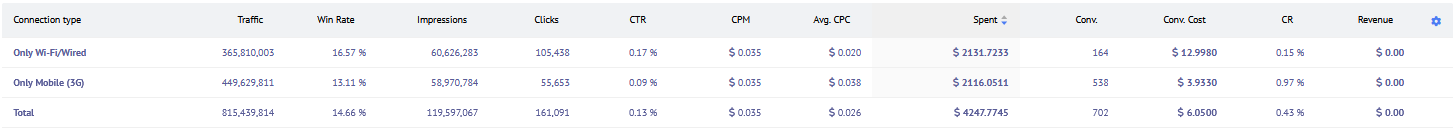 After the first week of gathering conversion data, we noticed that winrates and conversion rates were very different between 3G and Wifi traffic (screenshot), so we decided to have separate campaigns for these targeting segments.