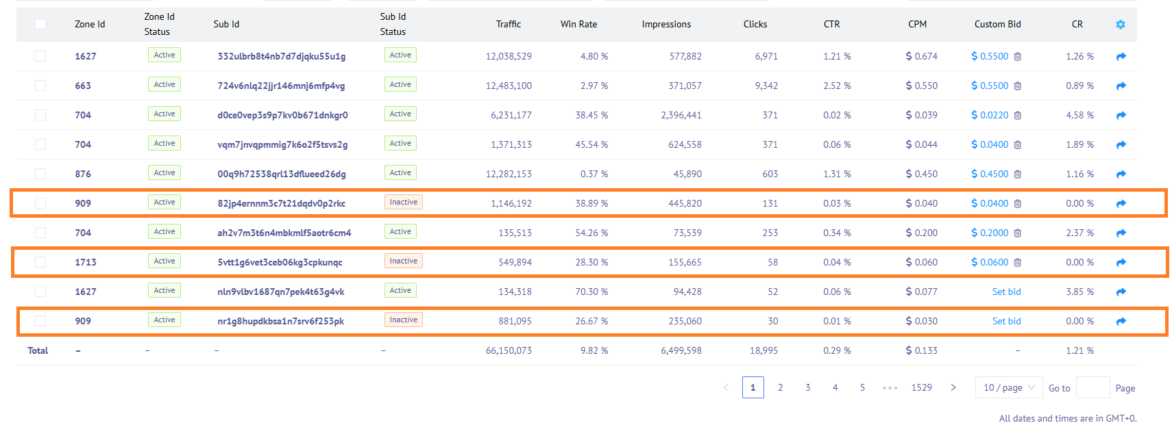 1. Analyzed zoneIDs and subIDs with low conversion rates.