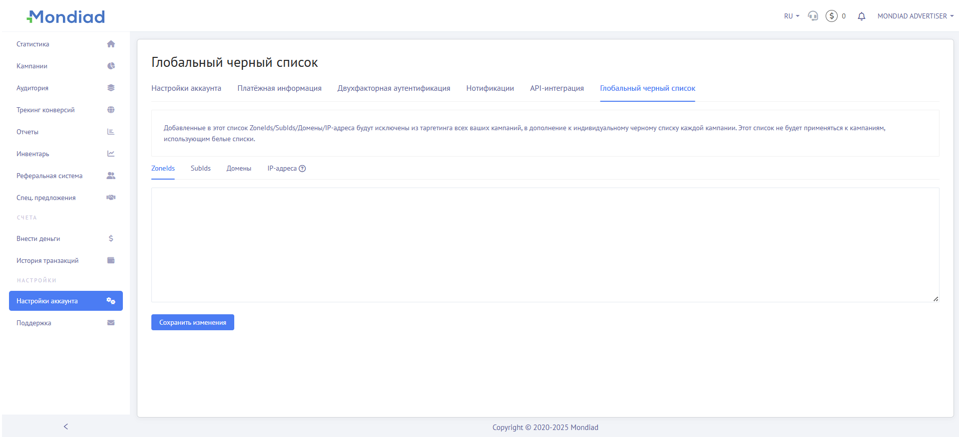 Идентификаторы зон/подыдентификаторов, добавленные в этот список, будут исключены из всех ваших кампаний с таргетингом по чёрному списку, а также из индивидуального чёрного списка каждой кампании. Этот список не будет применяться к кампаниям, использующим белые списки.