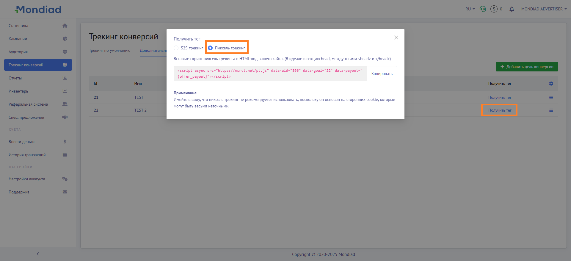 Второй метод отслеживания конверсий в нашей системе (помимо сторонних трекеров) — это наш бесплатный внутренний пиксельный трекер: